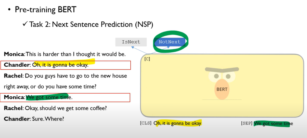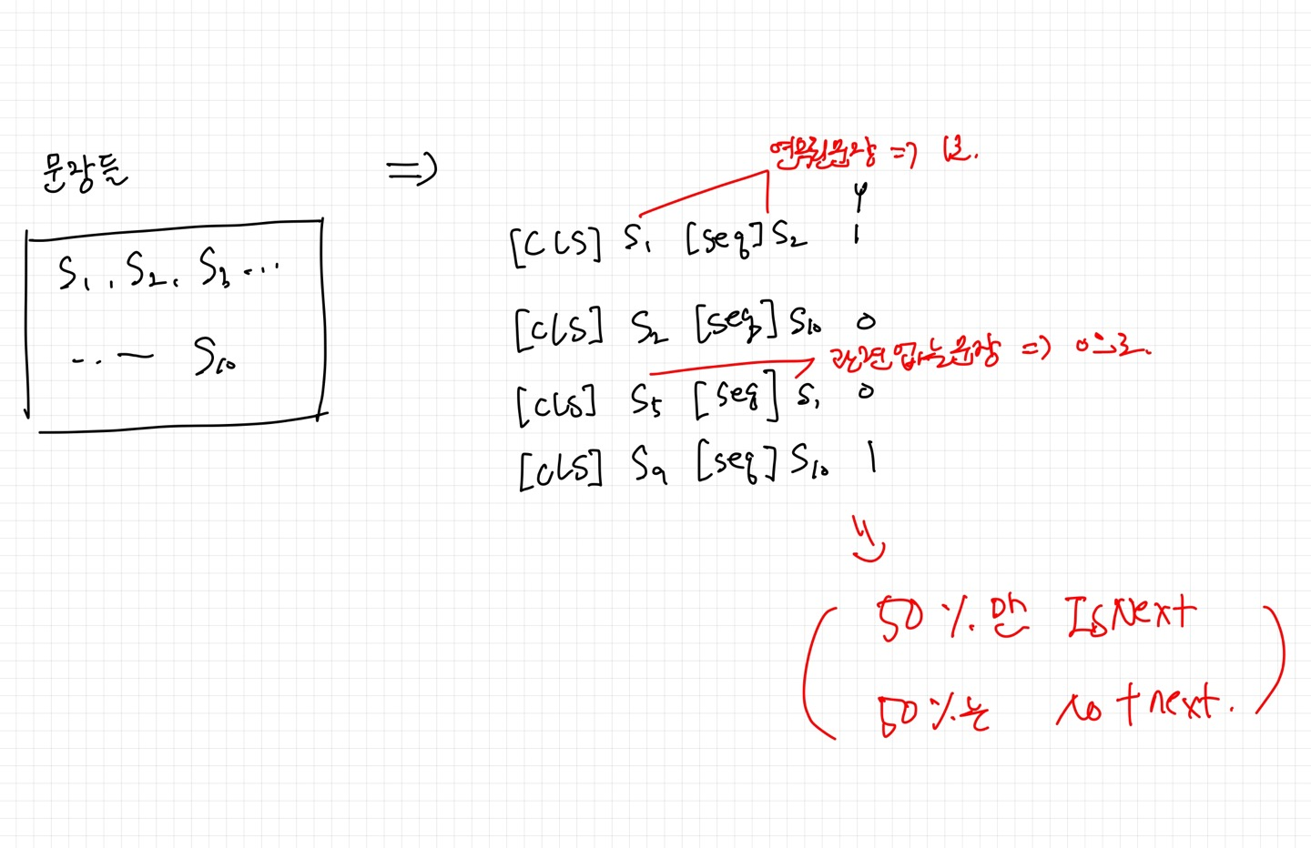 NSP를 사용하는 이유:⇒ 질문에 대한 답(QA) or 문맥있는 문장들(일반적인 흐름의 문장) 의 task들은 두 문장(앞뒤) 사이의 관계를 이해 해야 함.⇒ 두 문장 A,B를 입력으로 넣고, B문장의 50%은 A문장 다음으로 넣고, 나머지 50% 부분은 B랑 관련없는 임의의 문장을 넣음. 이때 B가 다음문장인 경우 (ISNEXT), 관련없는 문장의 경우 (NOTNEXT)라고 분류함.