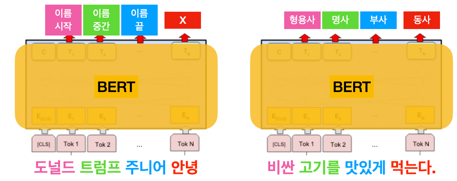 문장 내 단어 라벨링(Single Sentence Tagging Task) - 토큰 taggingex) 이 단어가 명사인지 형용사인지,,(형태소분석) 각 토큰에 대해 분류하는 것.ex) 김 ⇒ 시작 , 지 ⇒ 중간, 은 ⇒ 끝
