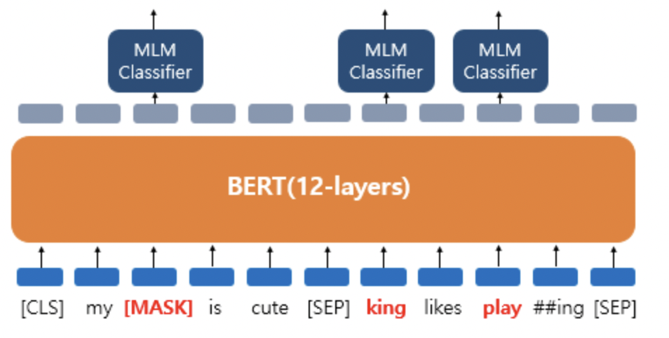 트랜스포머의 경우 단어를 input으로 넣으면 그 다음 단어가 output으로 나오도록 예측했지만, BERT의 경우 해당 단어를 mask 처리하고 그 단어가 무엇인지를 예측.