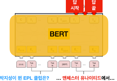 ⇒ "박지성이 뛴 EPL 클럽은?"이 주어졌을 때, 본문 중에 "... PSV 에인트호번과 잉글랜드 프리미어리그의 맨체스터 유나이티드, 퀸스 파크 레인저스에서 활동하였다...." ⇒ 밑줄이 그어진 부분을 예측함.