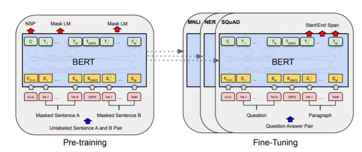 ⇒ 이 경우, LM을 통해서 학습하기 쉽지 않아서 NSP(다음 문장 예측)에 대해서도 함께 학습시킴.