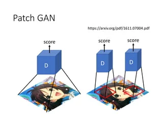 - 이미지 내 패치 단위로 진위 여부 판별하는 (판별자) discriminator 사용 (patchGAN)⇒ 장점: NxN patch 단위로 prediction 진행. 이때 patch size N은 전체 이미지 크기보다 훨씬 작기 때문에 더 작은 parameters와 빠른 running time을 가짐