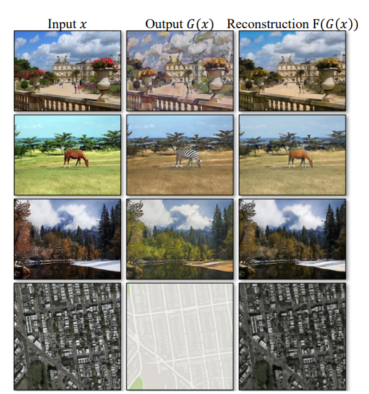 Figure 4: The input images x, output images G(x) and the reconstructed images F(G(x)) from various experiments. From top to bottom: photo↔Cezanne, horses↔zebras, winter→summer Yosemite, aerial photos↔Google maps Figure 4: 다양한 실험에서의 입력 이미지 x, 출력 이미지 G(x), 그리고 재구성된 이미지 F(G(x))입니다. 위에서 아래로: 사진↔세잔, 말↔얼룩말, 겨울→여름 요세미티, 항공 사진↔구글 지도