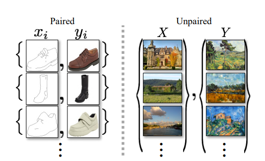 • unpaired data는 x와 y가 매칭되어있지 않기 때문에, 어떠한 입력이미지가 들어왔을 때, 어떠한 정답 이미지가 만들어져야 하는지 모름.
