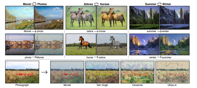 Figure 1: Given any two unordered image collections X and Y , our algorithm learns to automatically “translate” an image from one into the other and vice versa: (left) Monet paintings and landscape photos from Flickr; (center) zebras and horses from ImageNet; (right) summer and winter Yosemite photos from Flickr. Example application (bottom): using a collection of paintings of famous artists, our method learns to render natural photographs into the respective styles.