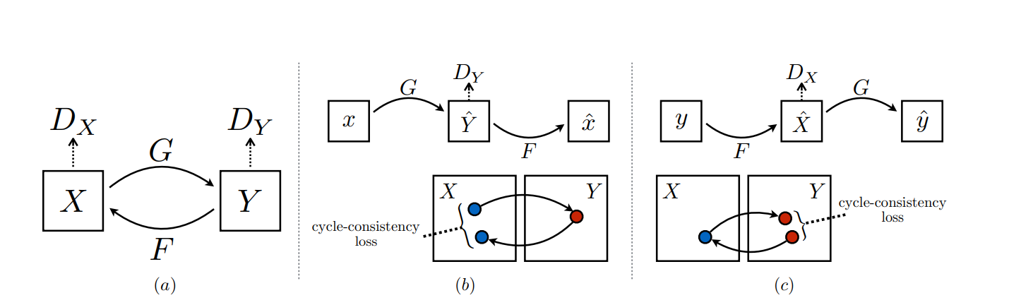 • Dx, Dy ⇒ 특정 이미지가 x 도메인의 이미지로 그럴싸한지 아닌지 판별할 수 있도록 만드는 역할