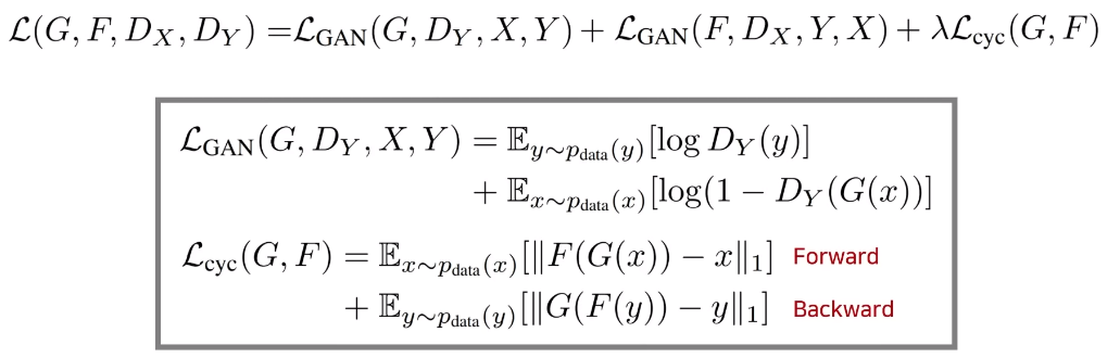 • L(cyc): 다시 원본 이미지로 돌아올 수 있도록 하는 식⇒ x → 원본대로 돌아오도록 (forward)⇒ y → 원본대로 돌아오도록 (backward)