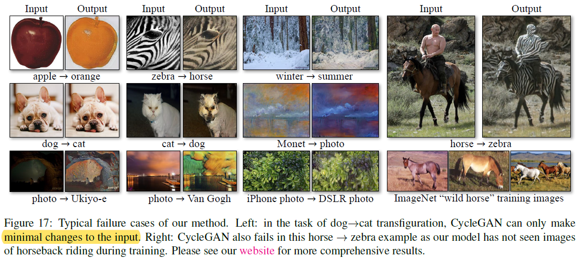우리는 먼저, 평가를 위해 입력-출력 쌍의 그라운드 트루스가 있는 페어 데이터셋에서 비짝지어진 이미지 간 변환에 대한 최근 방법들과 우리의 접근법을 비교합니다. 그런 다음, 적대적 손실과 사이클 일관성 손실의 중요성을 연구하고, 여러 가지 변형에 대해 우리의 전체 방법을 비교합니다. 마지막으로, 비짝지어진 데이터가 존재하지 않는 다양한 응용 분야에서 우리의 알고리즘의 일반성을 보여줍니다. 간결함을 위해, 우리의 방법을 CycleGAN이라고 지칭합니다. PyTorch와 Torch 코드, 모델, 그리고 전체 결과는 우리의 웹사이트에서 찾을 수 있습니다.