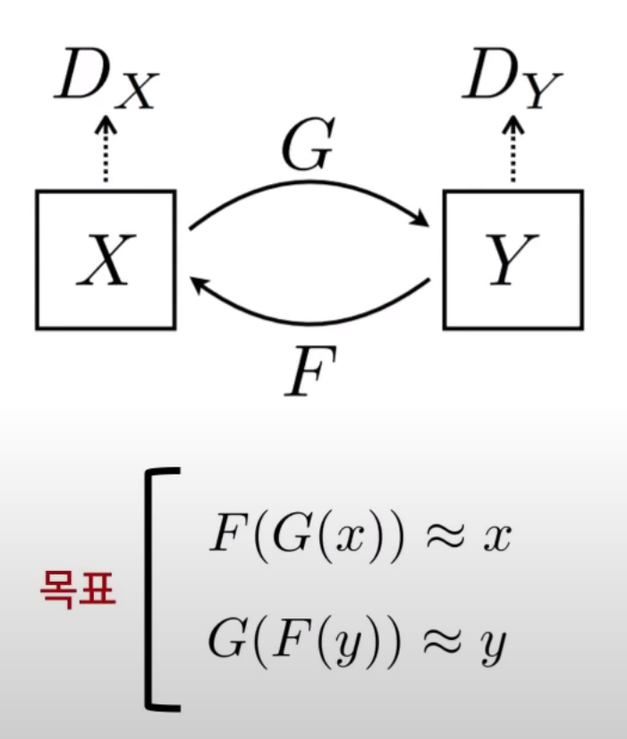 • 목표: F(G(x)) ~ x , G(F(y)) ~ y로 (원본이미지로 복구될 수 있는 형태로 학습)