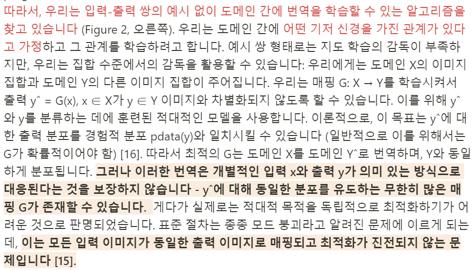 • 즉, 매칭되는 y없이 단순히 입력 x의 특성을 도메인 y로 바꾸고자 함. 그렇게 되면, 어떤 입력이 들어와도 내가 만들고자 하는 특정 하나의 output을 생성하려고 하면, 하나의 동일한 output 만 도출하게 된다는 것을 의미함.