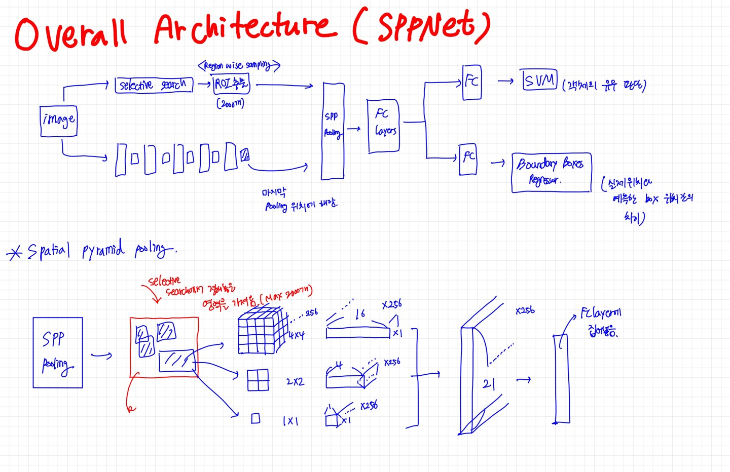 CNN 계층 반복하다가 마지막 부분에서의 풀링을 SPP pooling으로 바꿔버림
