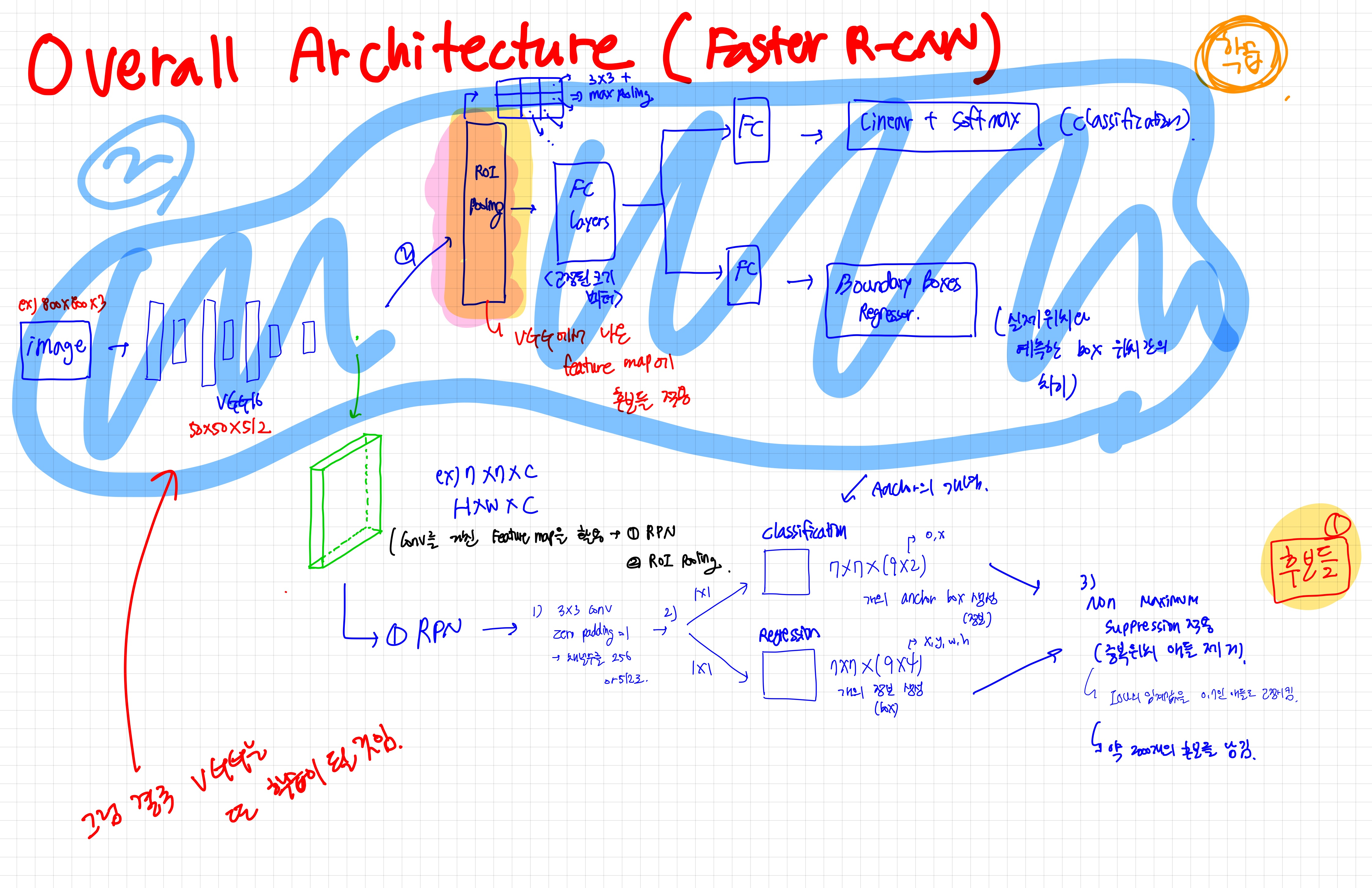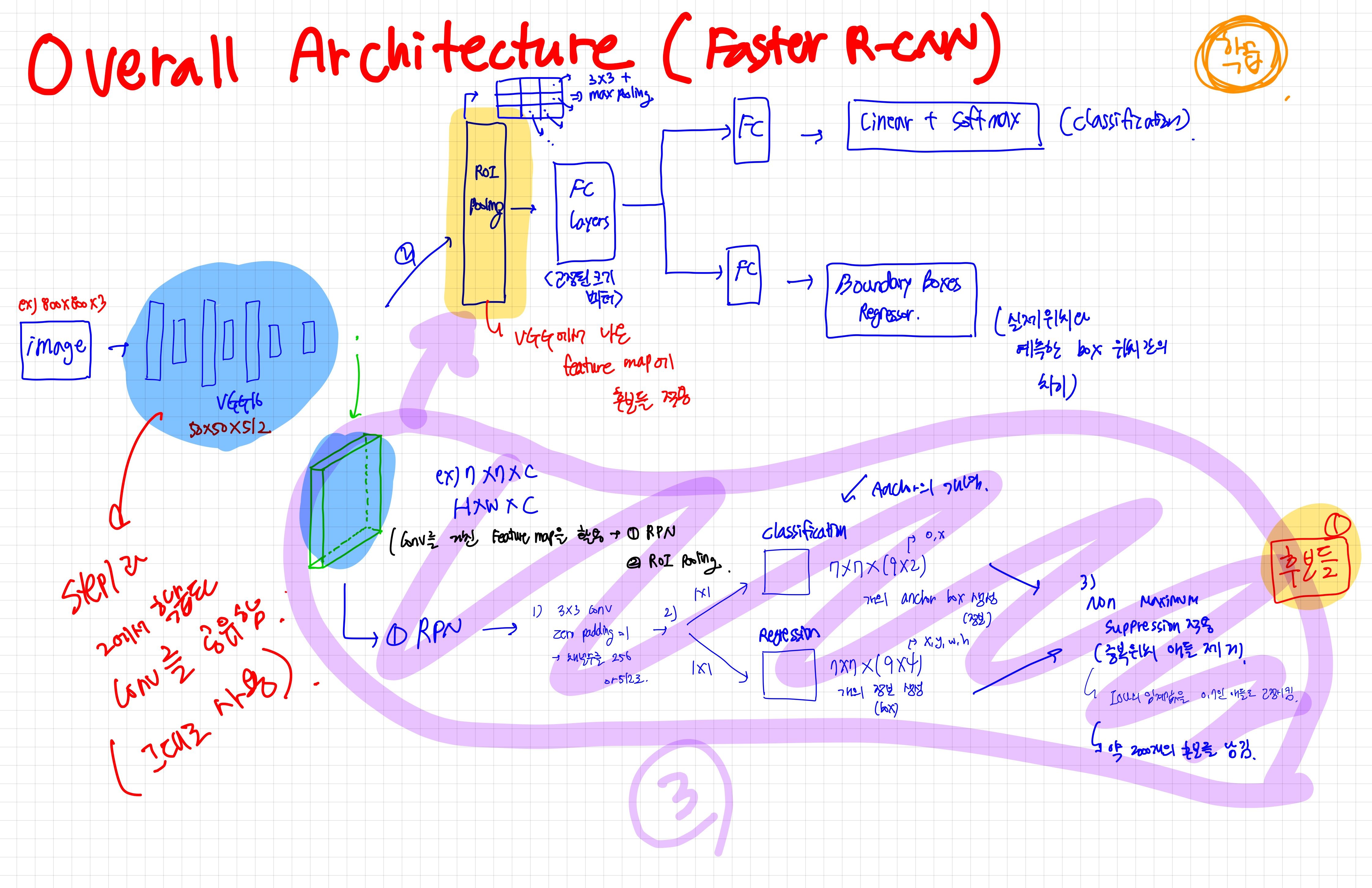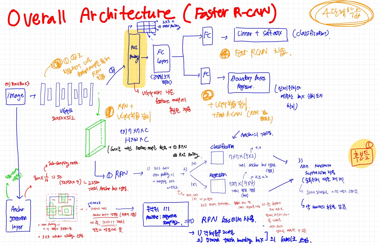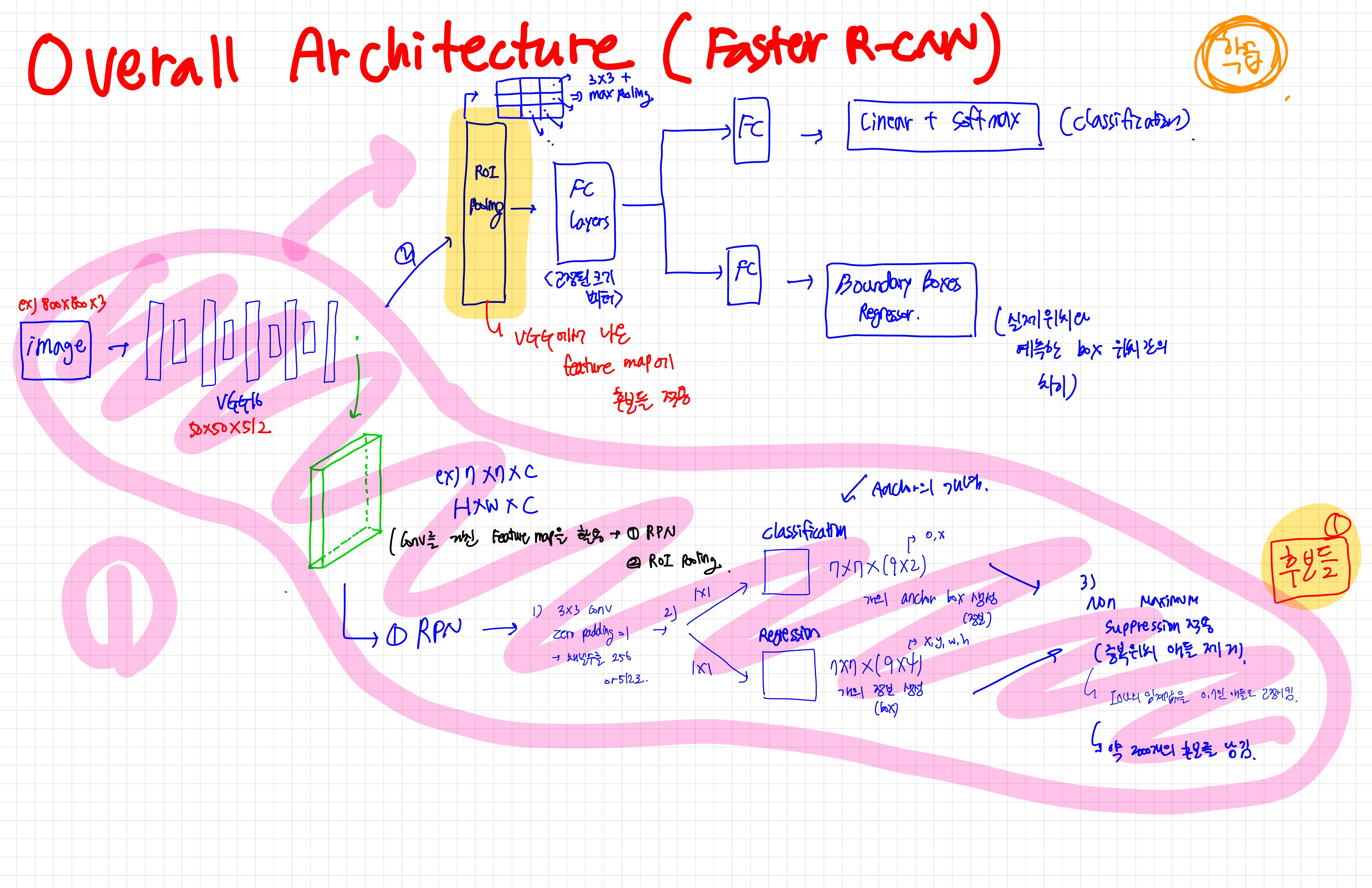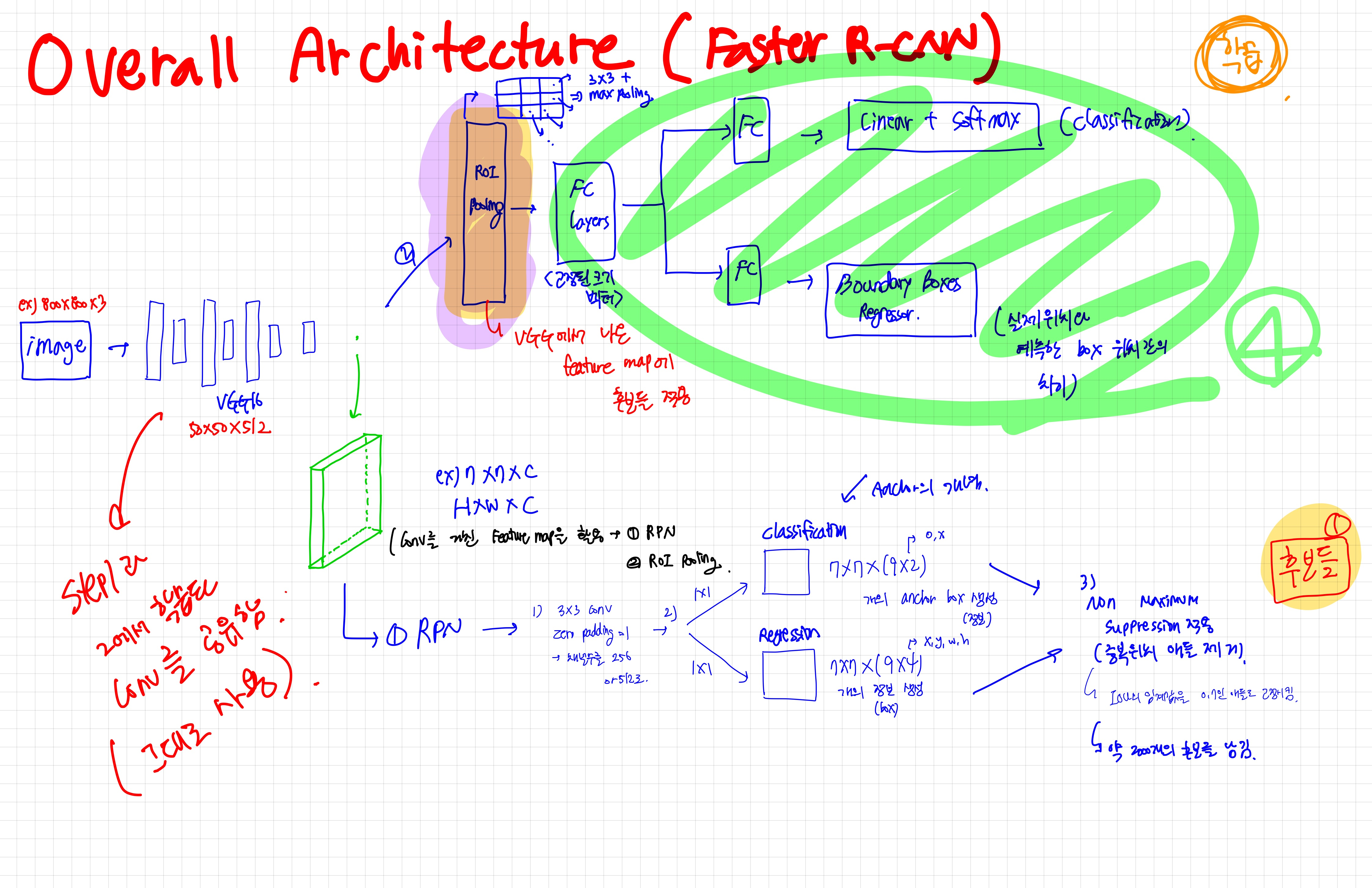 1번과 2번을 토대로 해서 나온 VGG feature map을 공유.⇒ VGG(feature map)을 가지고 RPN을 한 번 더 진행한 후, ROI pooling에 후보 영역들을 집어넣음