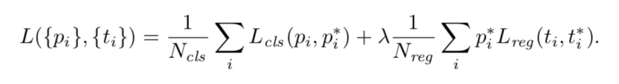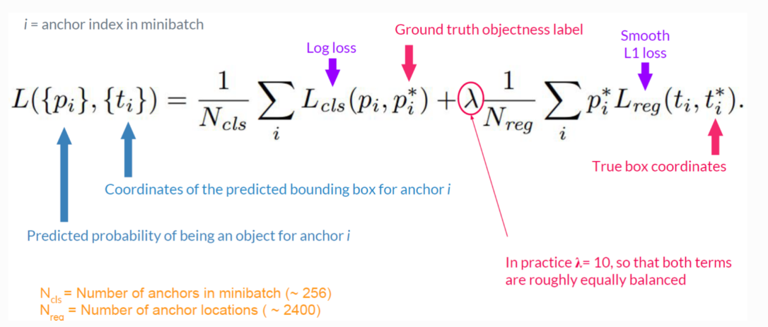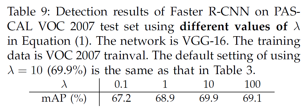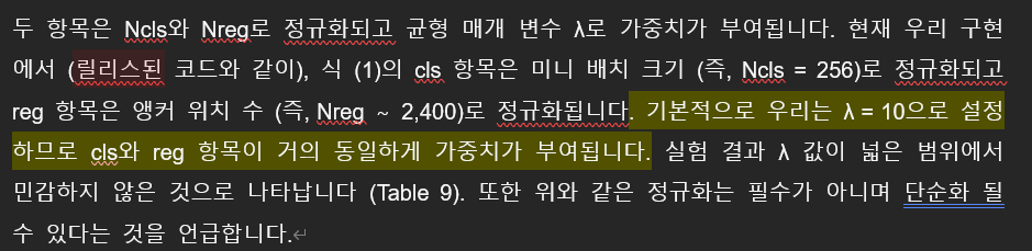 ※ Faster R-CNN에서는 앵커박스가 대부분 배경에 해당하기 때문에, 객체 유무 판단이 bounding box regression보다 더 중요하다는 것에 기반을 둠. 따라서, 람다를 10으로 설정했을 때가 두 손실의 기여도가 균등하게 되는 것임!