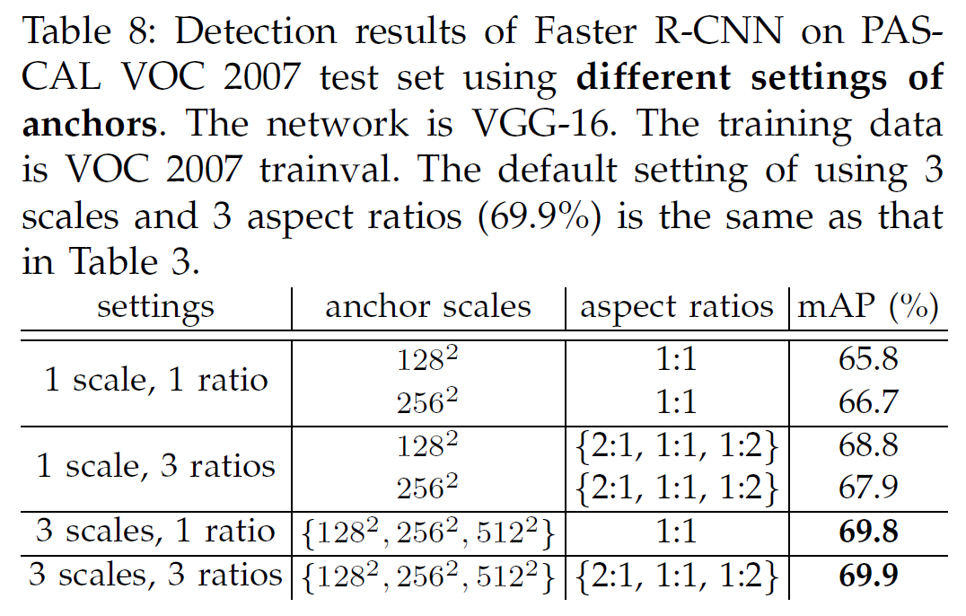 총 결과로써는 사실 별로 큰 차이가 없었음 (3가지 scale 과 1가지 aspect ratio, 3가지 aspect ratio를 사용해본 결과)