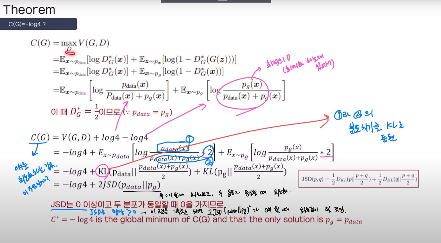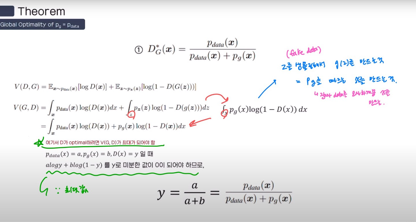 - 어떠한 G가 들어오던지 간에, 최적의 D는 뭘까? ⇒ 위의 식을 가질 때 가장 최적이다! 라는 것을 증명함