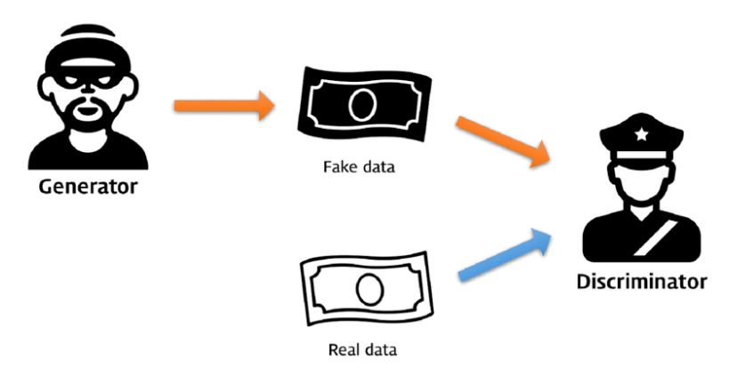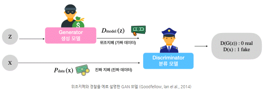 - ex) 위조지폐범(G)는 경찰(D)을 속이기 위해 위조지폐를 만들고 경찰은 이것을 진짜 지폐는 1, 가짜 지폐는 0으로 판단하여 구분함.
