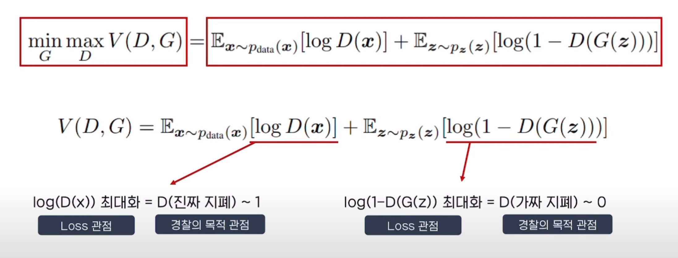 - G는 오른쪽 식을 최소화하는 것이 목적, D는 최대화 하는 것이 목적
