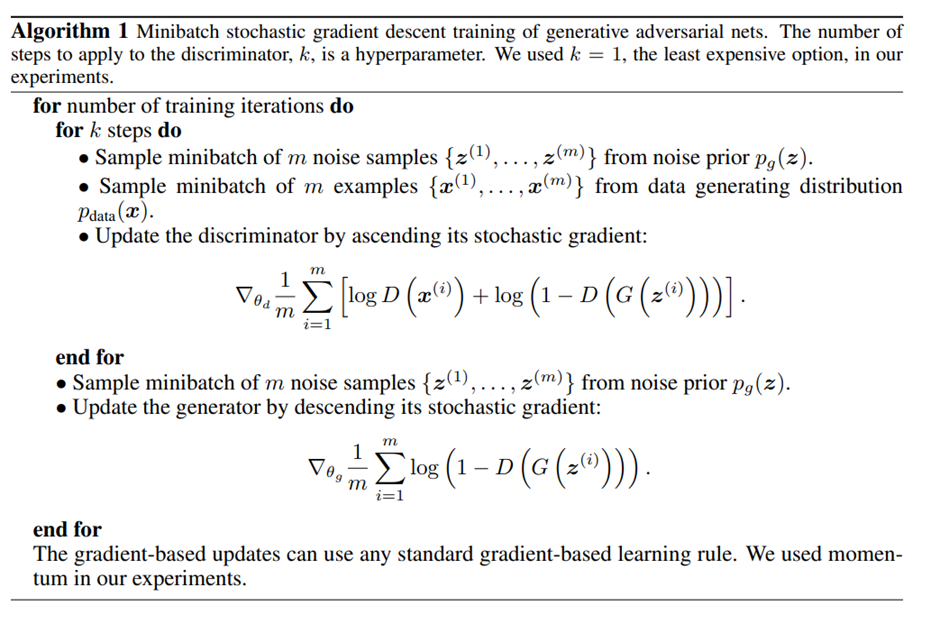- 매 에폭당 k번 D 학습한 이후에, G 학습