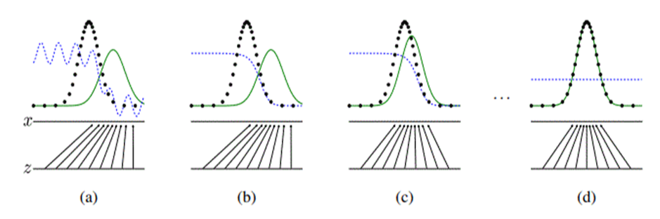 - (a): 학습초기에는 real과 fake의 분포가 전혀 다름. D의 성능도 썩 좋지 않음