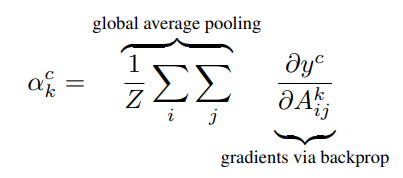 ➡️ 즉, y^c를 해당 피처맵 A의 각 픽셀로 미분한 후에, GAP를 하면, 중요도 가중치를 얻게 됨