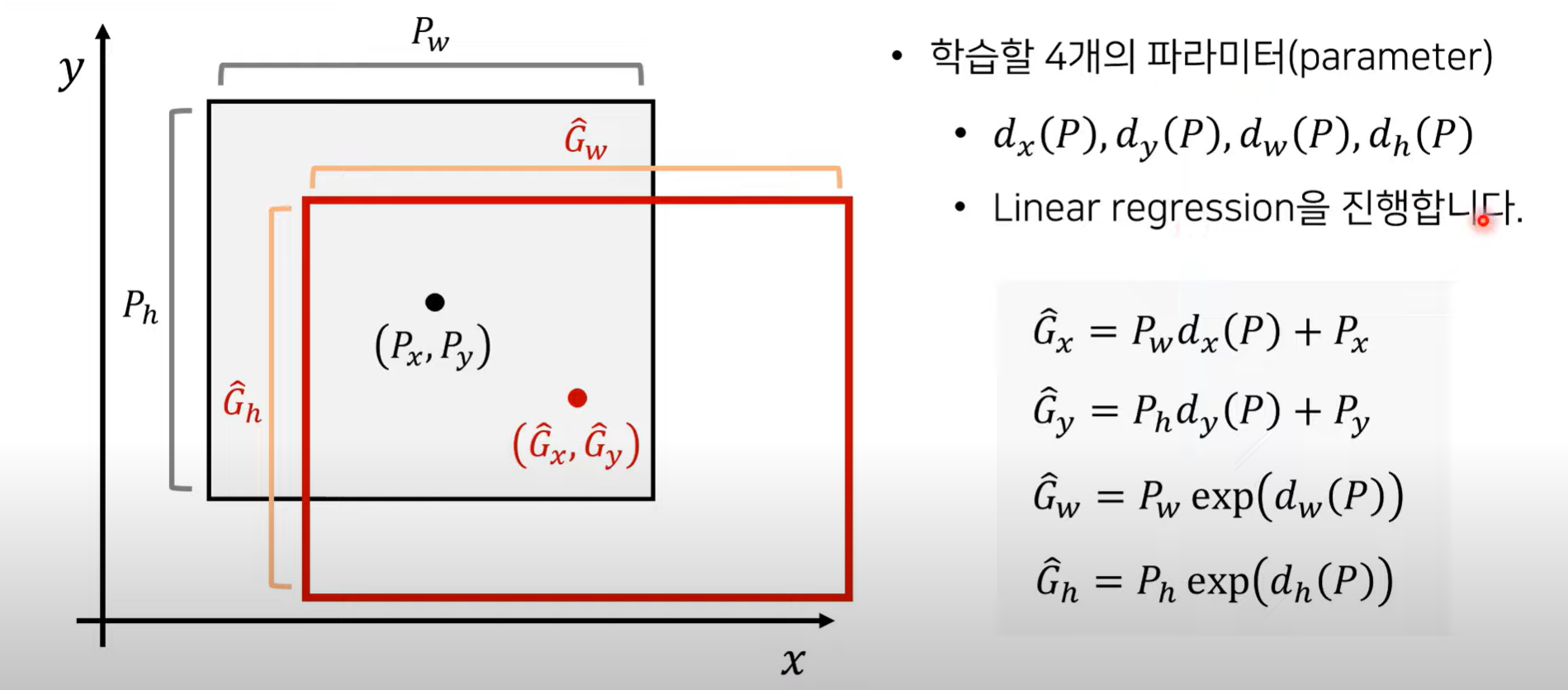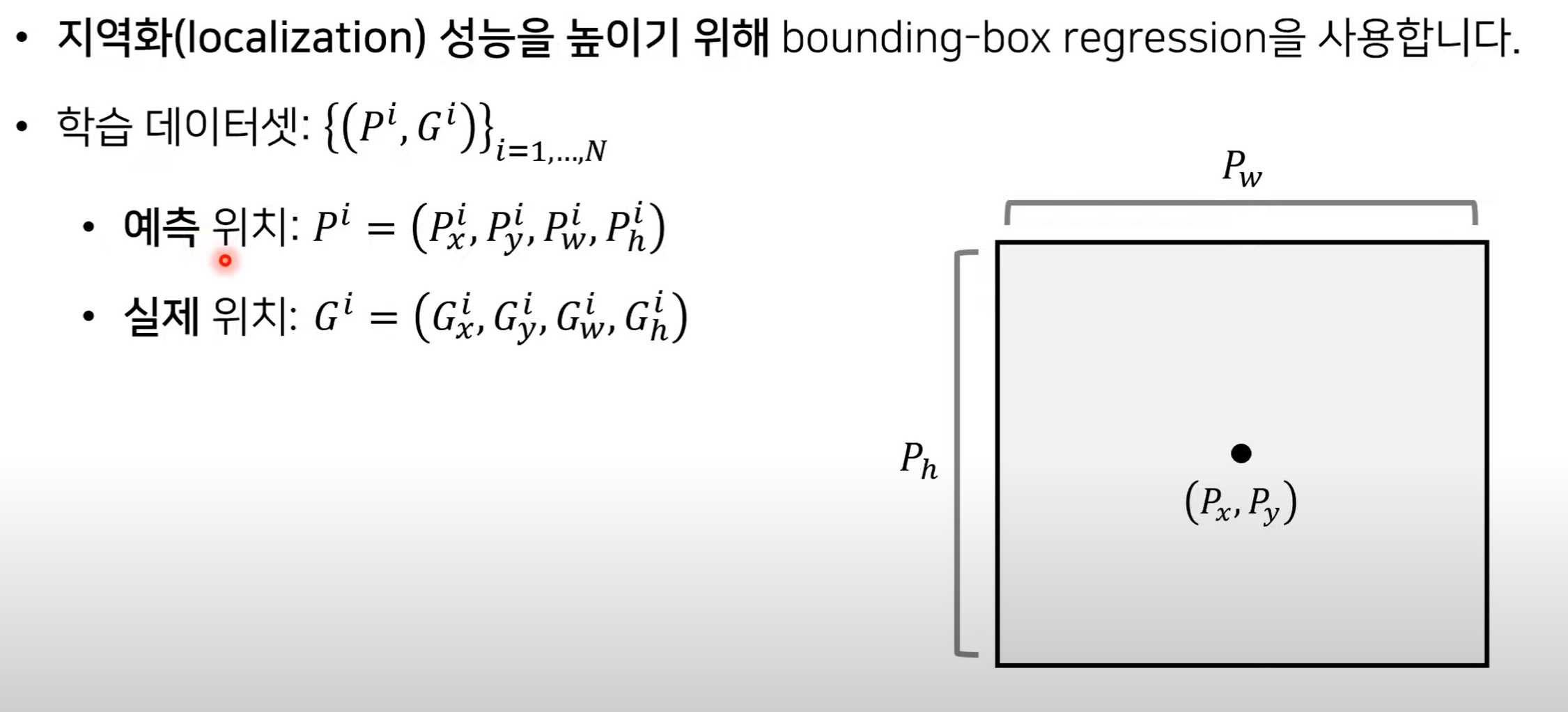 ※ selective search로 검출된 2000개의 bounding box에 모두 적용하는 것이 아니라, ground-truth box와 IoU(Intersection over Union)가 가장 높은 bounding box를 선택하여 bounding box regression을 적용했음