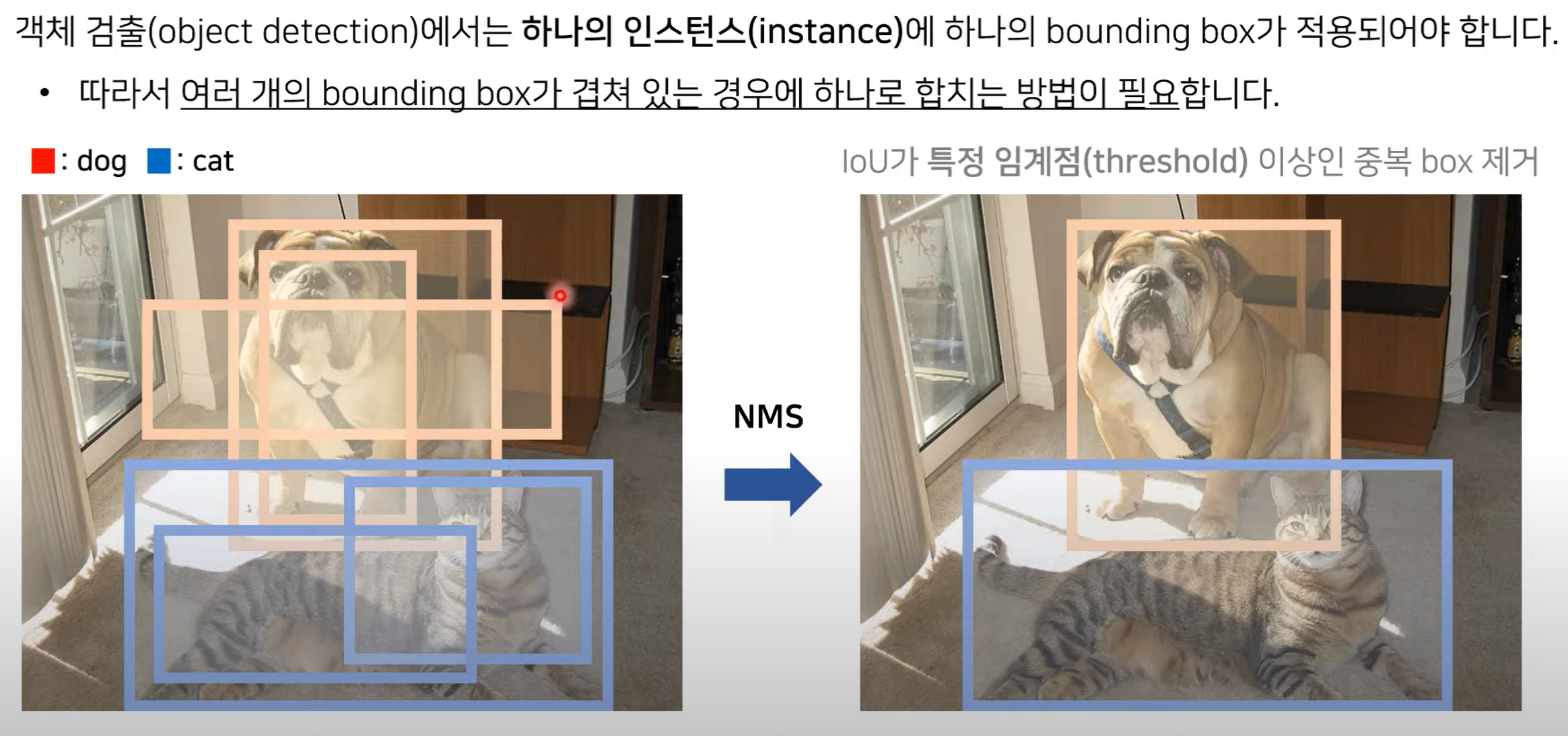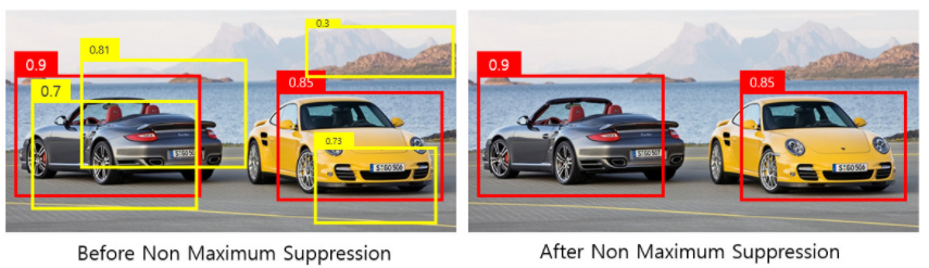 왜?: 2000개의 bounding box를 전부 다 표시할 경우, 하나의 객체에 대해서 많은 bounding box가 겹칠 수 있음. 따라서 가장 적합한 box를 선택하는 알고리즘 진행.