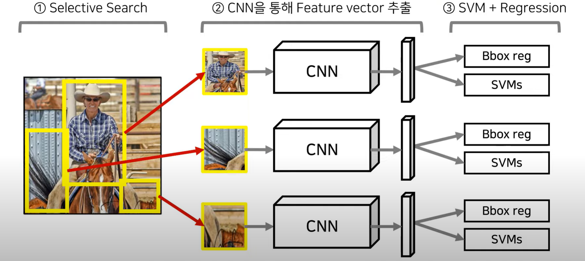 - (1) region proposals로 object 위치를 알아내고, 이를 CNN에 입력하여 class를 분류.