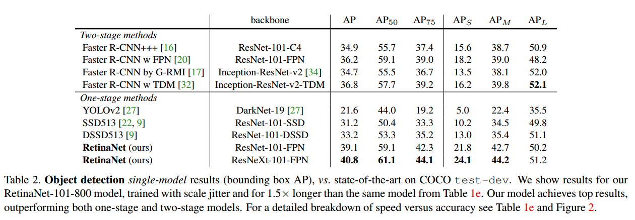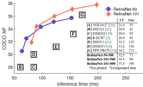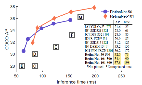 - one-stage의 가장 주요한 obstacle이었던 class imbalance문제를 해결하기 위해 Focal Loss를 제안하였고, 성능을 입증.