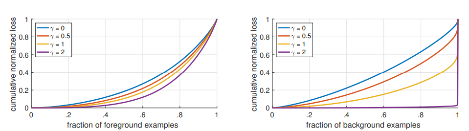 - 파라미터 γ은 easy example의 가중치가 작아지는 비율을 더 부드럽게 조정해줌.