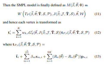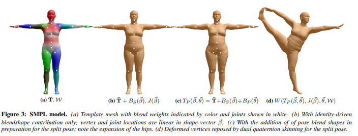 SMPL은 적절한 shape blend shapes(체형) pose blend shapes(자세, 관절 움직임)를 사용하여 자연스럽고 현실적인 변형을 가능하게 한다.