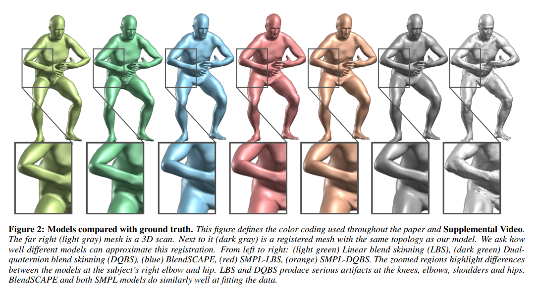 : skinned vertex 기반의 모델로서, 다양한 인간의 체형을 현실적으로 나타내고 자연스러운 자세에 따른 변형을 취할 수 있으며 연조직 움직임을 나타낸다.