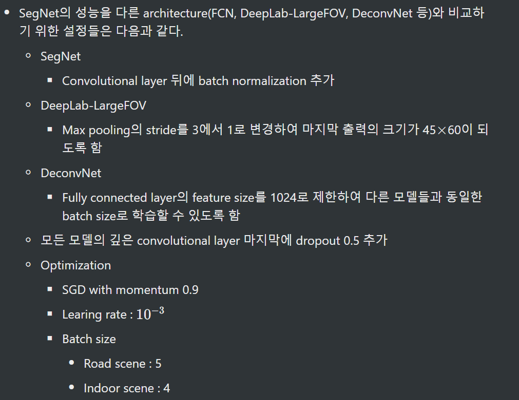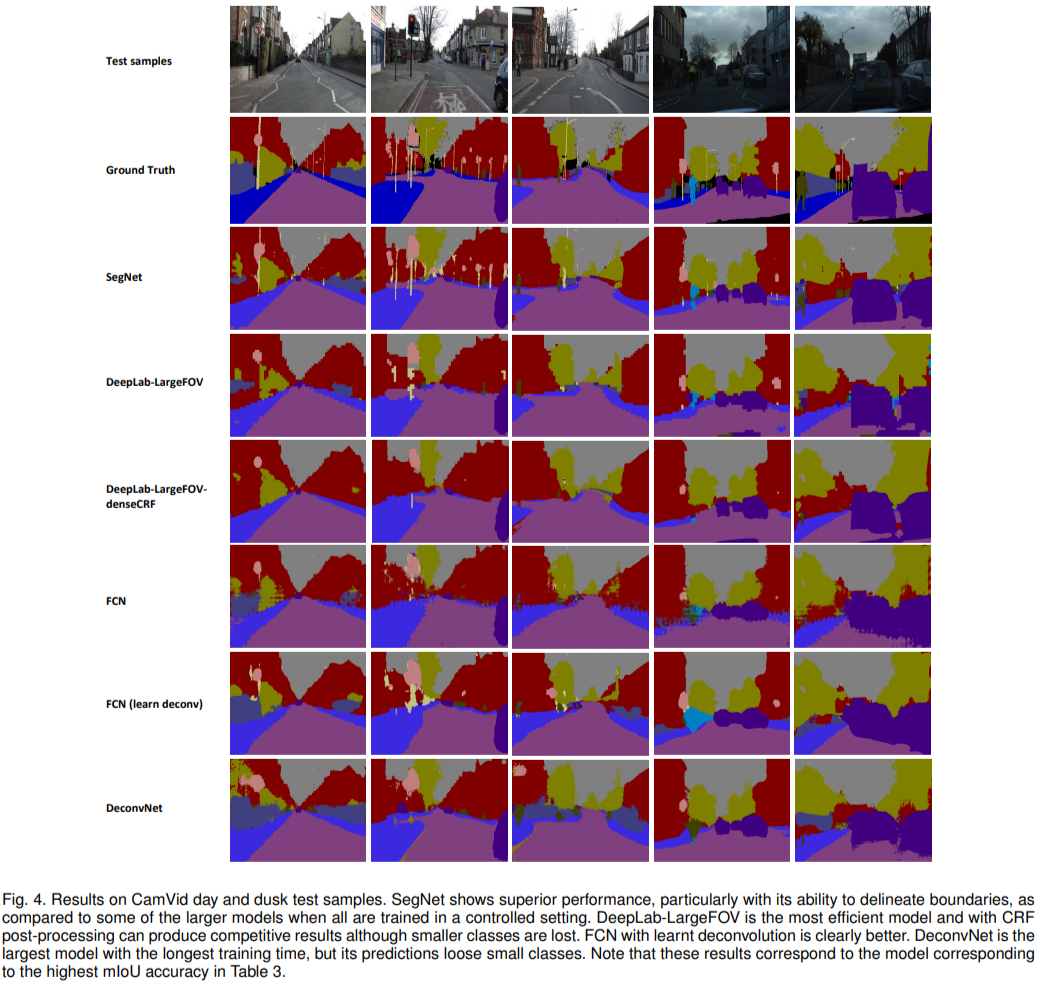 - class간 boundary 부분에서 SegNet이 다른 모델들보다 더 정교하게 boundary를 구분하고 small 객체도 잘 잡는다.