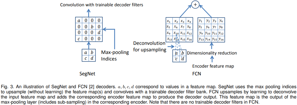- encoder에서 모든 feature map을 저장하는 아키텍처의 경우 성능은 우수하지만 메모리 사용량이 많아지는 단점이 있다. 그러나 SegNet은 un-maxpooling을 사용하여 메모리 사용량을 줄이면서 성능도 개선하였다.
