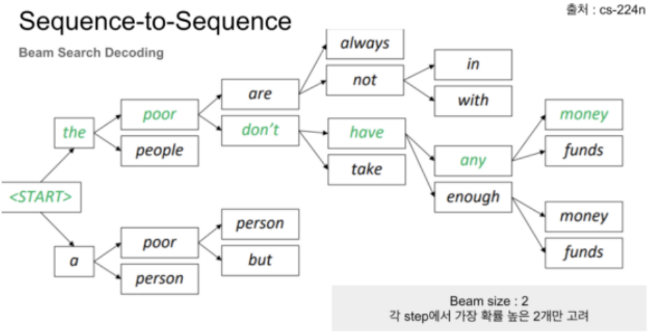 - 하나의 출력값만 내보내는 것이 아니라, beam(k)개수 만큼 출력값을 내놔서 여러 후보군을 줘서 문장을 출력시킴 ⇒ 마지막에 가장 좋은 출력 문장이 뭔지를 판단하는 방법을 말함