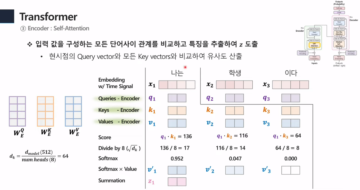 - Q,K,V의 값을 만들고, Q와K끼리의 내적곱을 해줌.