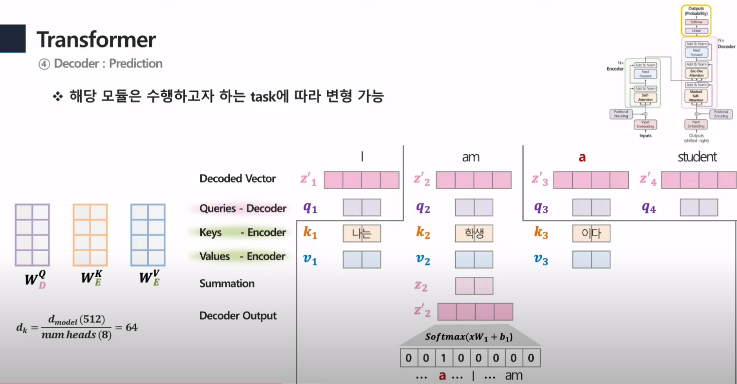- 두번째 multi head attention의 경우, Q는 7번의 값을 통해 만들고, K와 V는 encoder의 마지막에서 나온 값을 사용함.