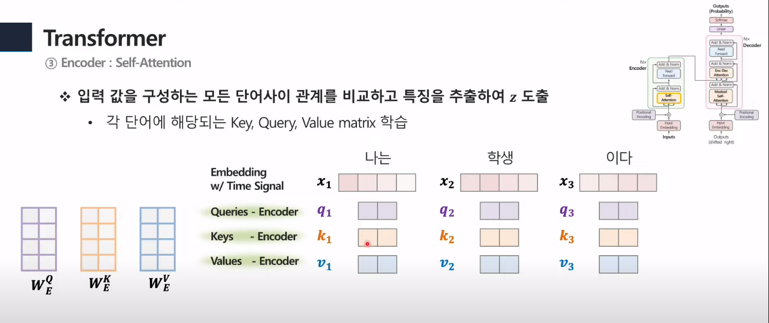 - 이때, V는 encoding의 embedding에서 나온 값에 가중치 곱한 것을 의미.