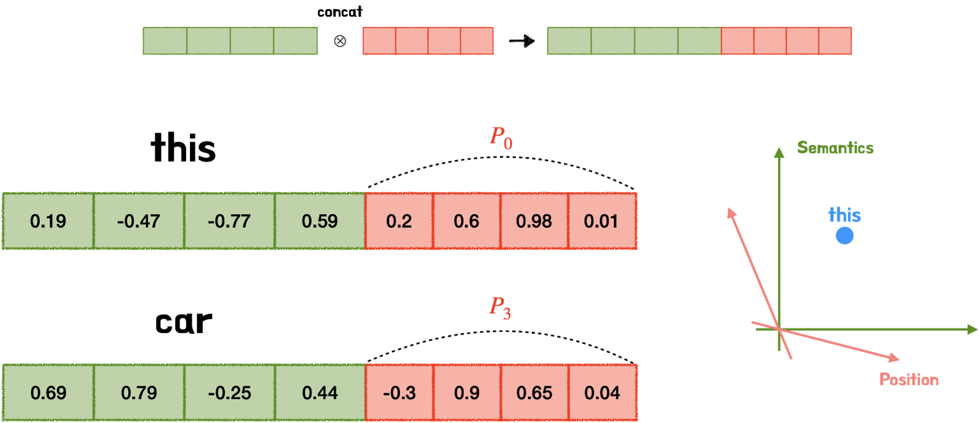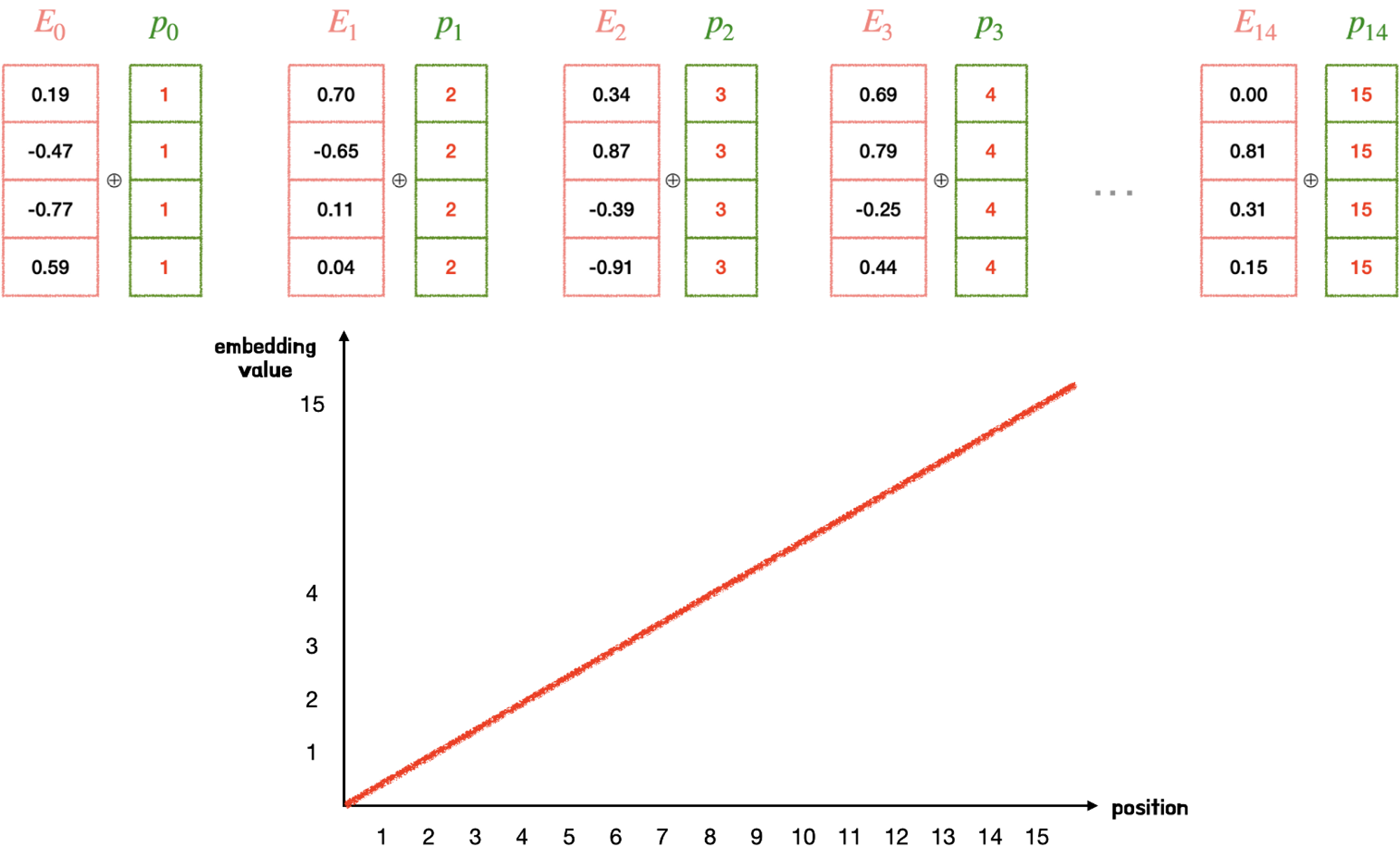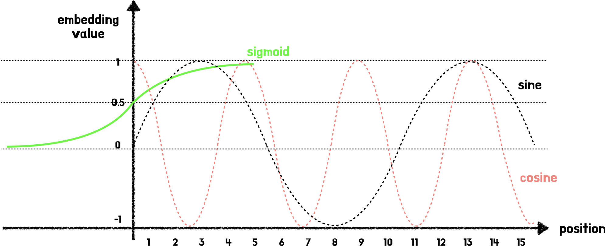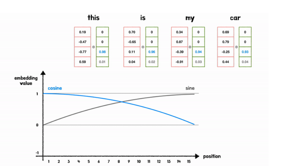 → postional encoding은 스칼라가 아닌 벡터로 이루어져있어 단어 벡터와 같은 차원을 지님.