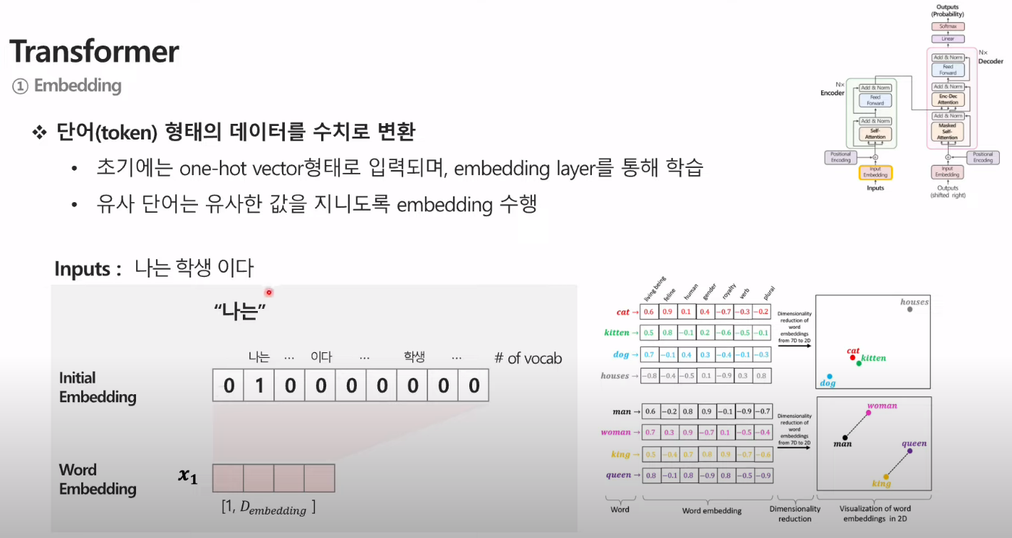 - 학습 시) 정답 문장을 embedding으로 넣음. positional encoding을 더해서 각 단어의 순서에 대한 정보 부여.