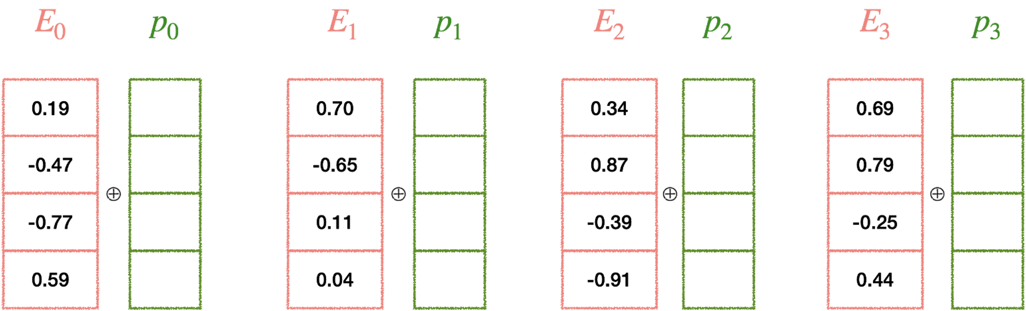 - 그렇기 때문에 차원이 4개로 표현한다고 가정하면 각 요소는 서로 다른 4개의 주기를 갖게 됨 (짝수 홀수)