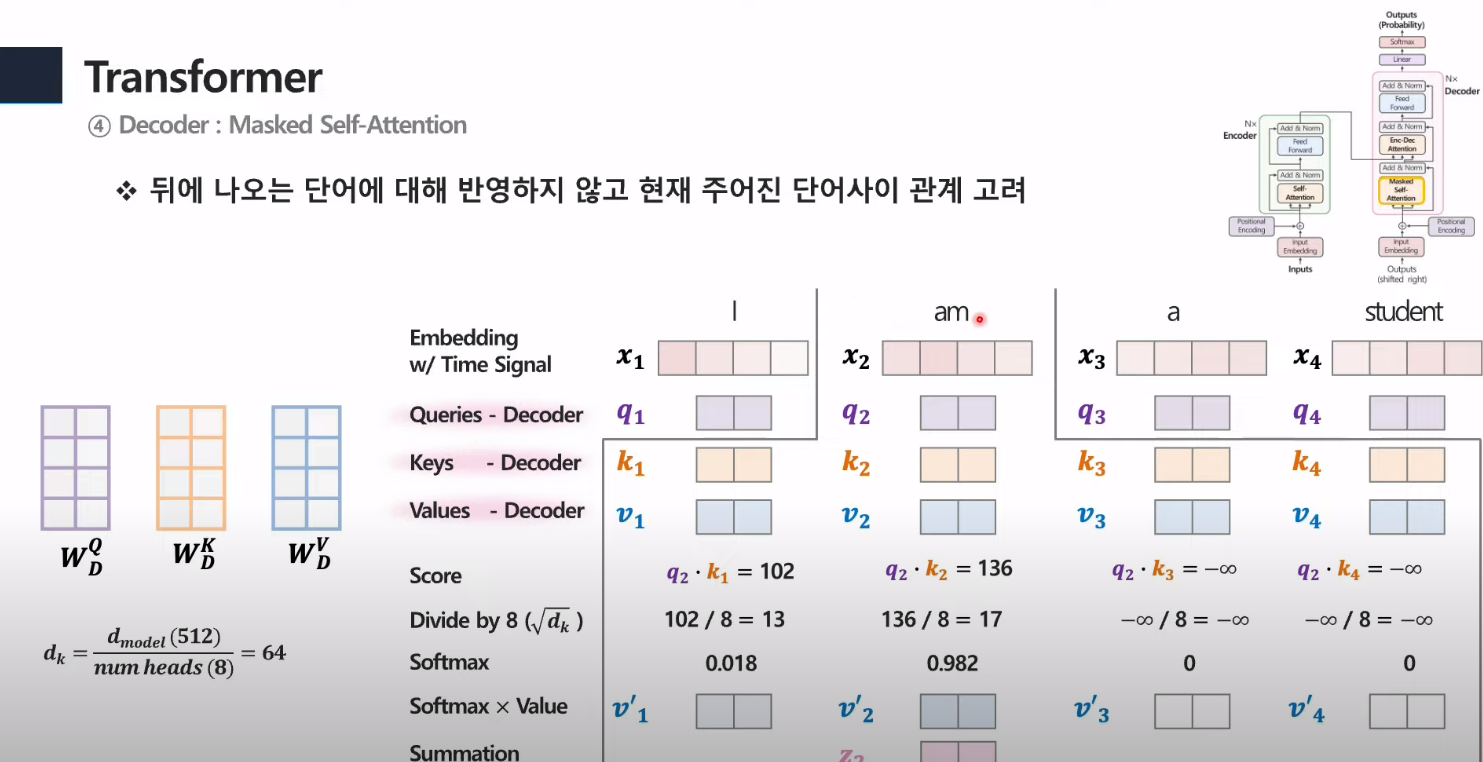 - 그 단어만 뽑은 값과 그 앞의 단어들만 softmax를 통해 확률로 변환하고, V값과 곱해줌