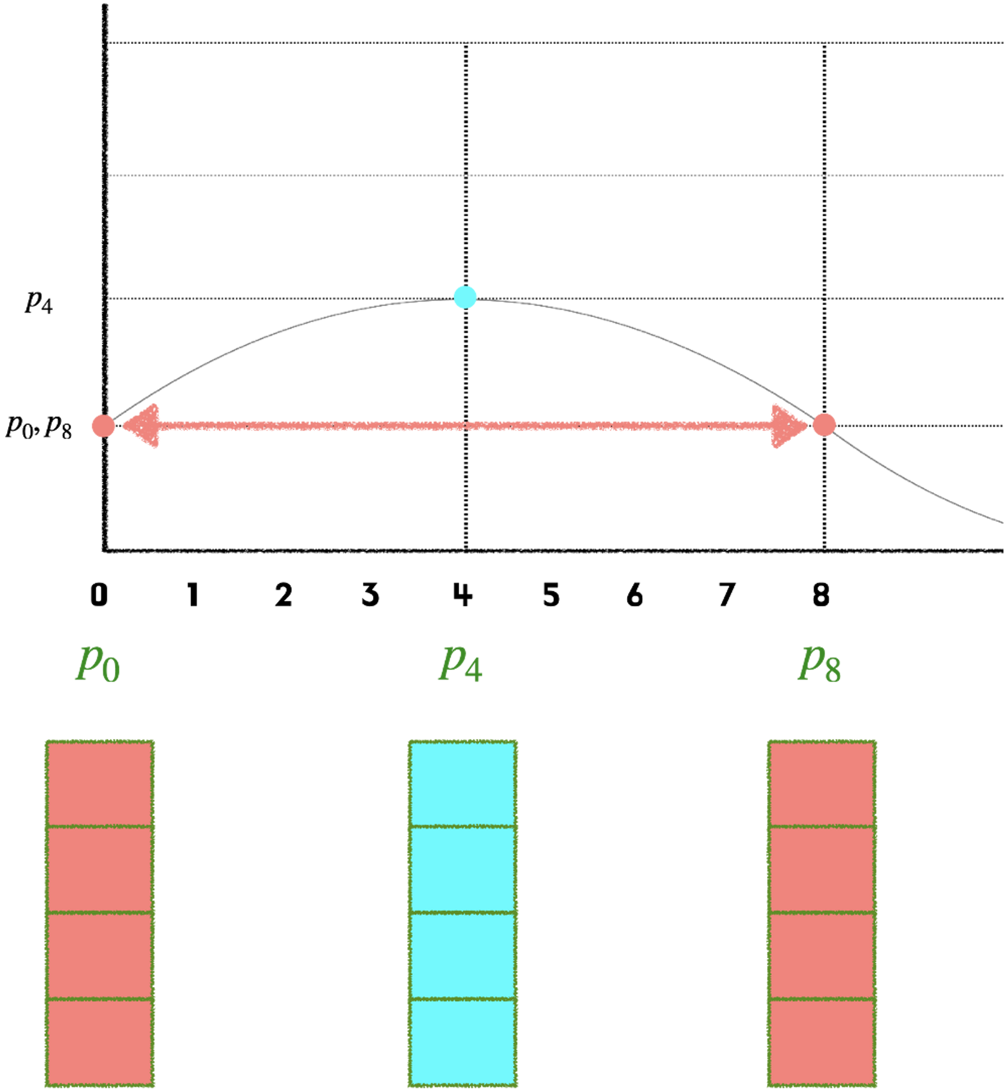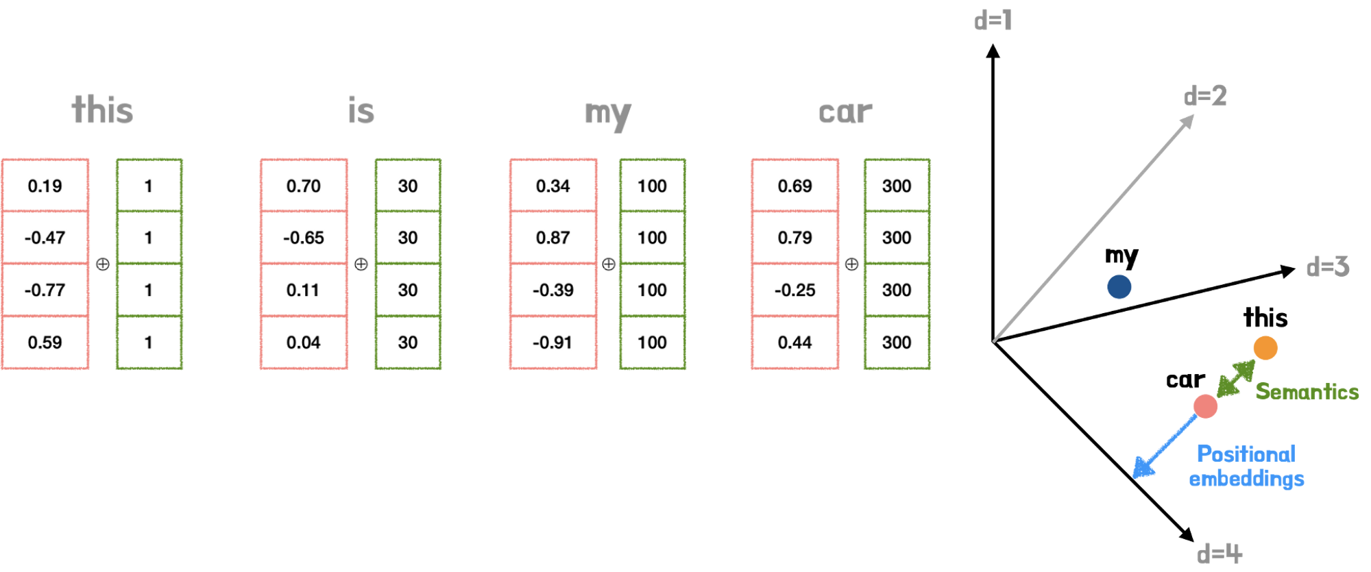 - 그렇기 때문에 차원이 4개로 표현한다고 가정하면 각 요소는 서로 다른 4개의 주기를 갖게 됨 (짝수 홀수)