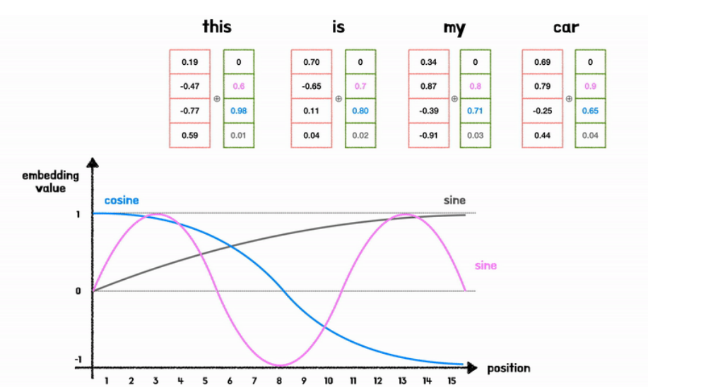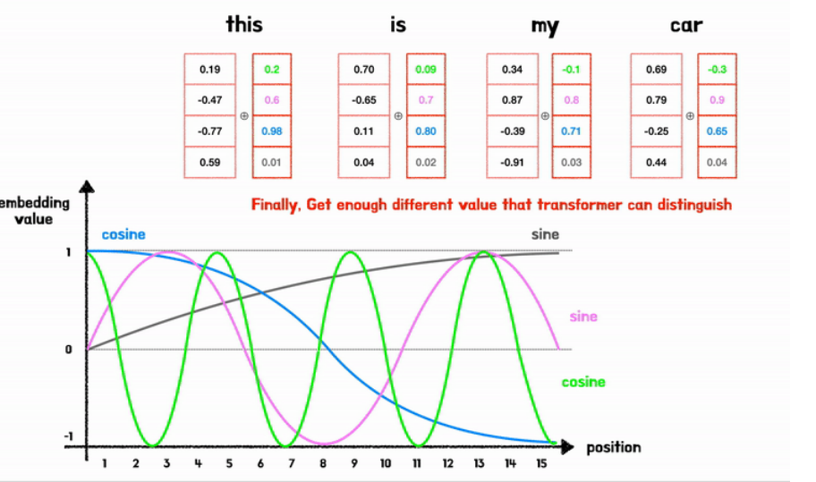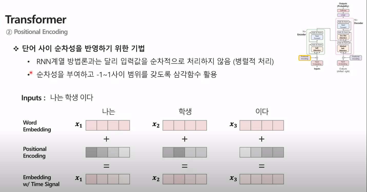 → postional encoding은 스칼라가 아닌 벡터로 이루어져있어 단어 벡터와 같은 차원을 지님.