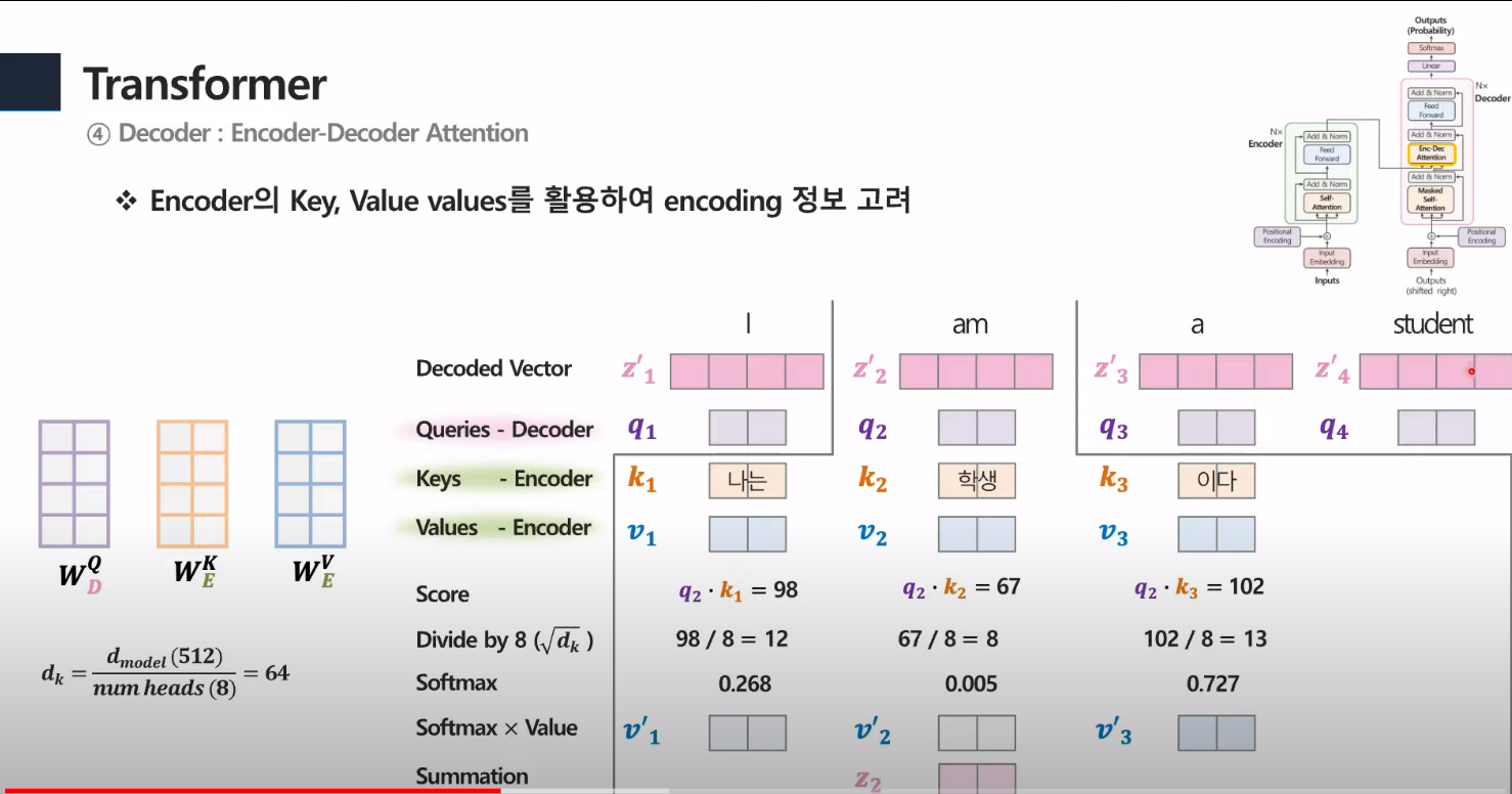 - 이때, V는 encoding의 embedding에서 나온 값에 가중치 곱한 것을 의미.