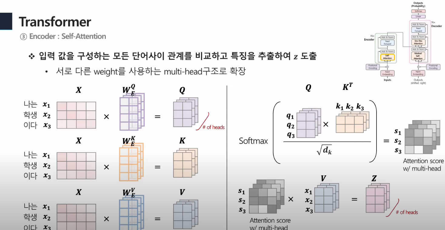 - ex) head가 3개면, 각 Q,K,V에 해당하는 가중치 3개씩 존재함 (Linear) ⇒ 총 9개의 다른 값이 생기게 됨