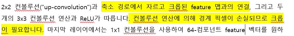 - contraction path에서 추출된 feature map (경계 부분을 crop) 을 concat