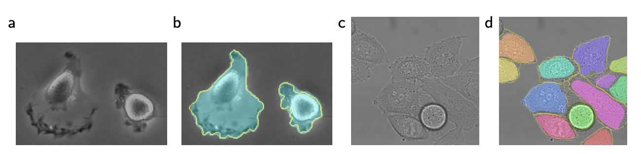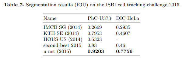 - a, c와 같이 광학 현미경에서 얻은 이미지로 b, d와 같이 세포를 구별하는 task를 U-Net이 얼마나 잘 수행하는지 시험해봄.