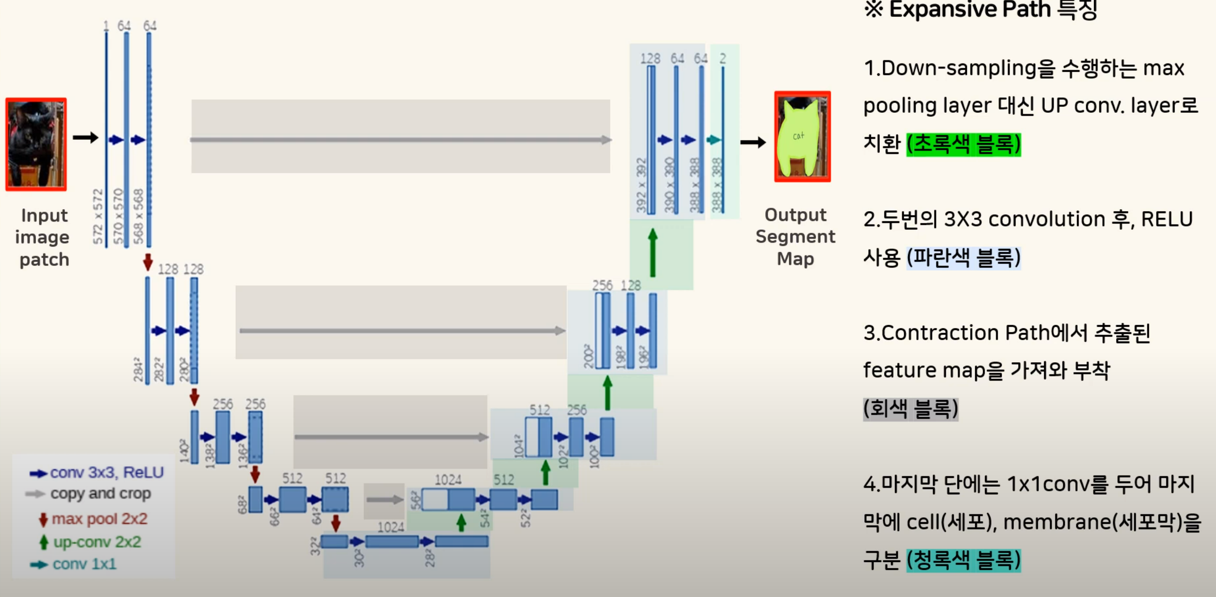 - 작아진 feature map을 Upsampling 해서 원본 이미지와 비슷한 크기로 늘려준 후, Contracting Path의 feature map과 결합하여(회색 화살표 부분) 더 정확한 위치 정보를 가진 segmentation map을 얻게 됨.