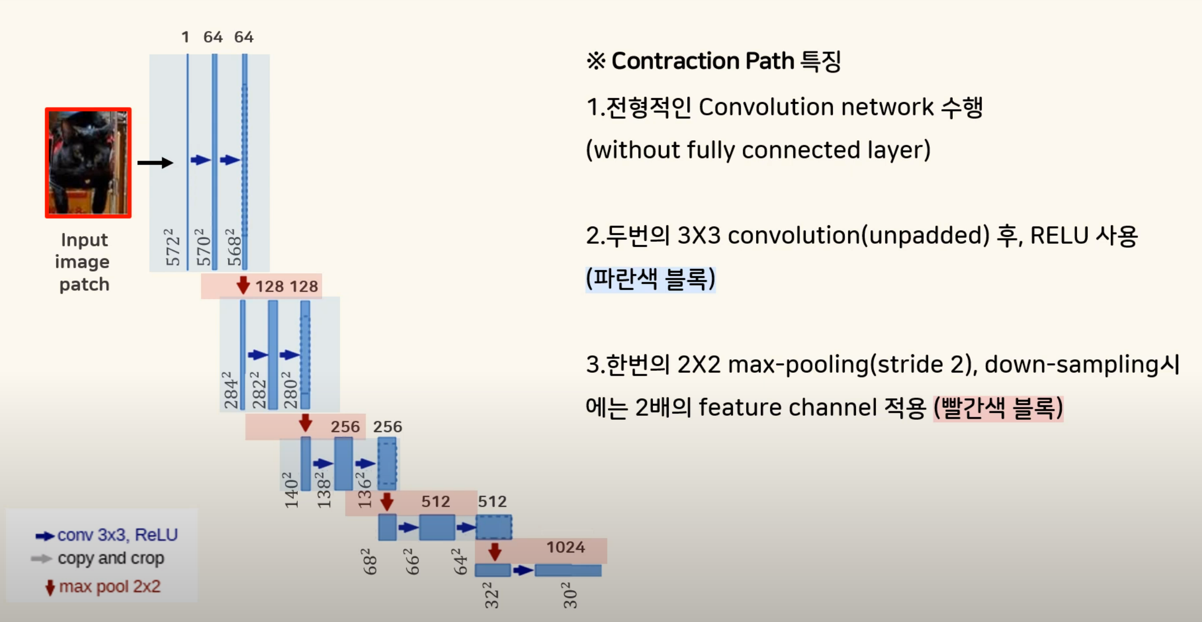 - contraction path에서 추출된 feature map (경계 부분을 crop) 을 concat