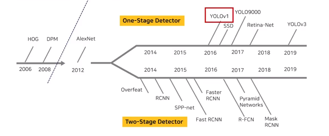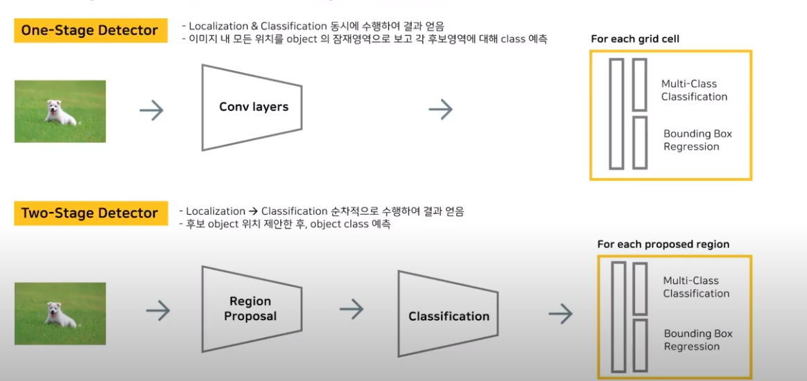 - one stage: localization+classification을 동시에 수행ex) conv를 통과한 후, 각 grid cell 마다 classification결과와 bounding box regression을 통해 결과 도출